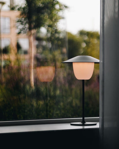 The Blomus ANI Lamp 3in1 Rechargeable LED is versatile, adaptable and brightly beautiful. The mobile LED lamp with matt colored powder coated aluminum can be used everywhere. The lamp can be used directly on the base, standing on the table as a traditional lamp, or hanging from the included rope. With a light touch of the lampshade, two brightness levels can be controlled or lamp can be switched off. For recharging, the lamp can be placed on the charging cradle and charged with the USB cable (both included). ANI is for outdoor or indoor use and is splash-proof. (Do not submerge in water). Run time is 8-16 hours on a charge, depending on brightness level used. Available in 4 colors: white, satellite (taupe), magnet (charcoal), and bark (rose/grey).