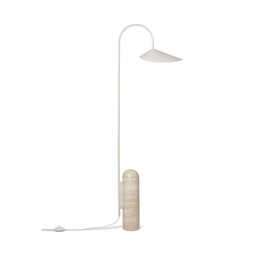 A study in contrasts, our Arum Floor Lamp is distinguished by its asymmetrical shade that rests on a slender metal stem and travertine base. The curved, petal-shaped shade is painted white on the underside to evenly distribute soft, ambient light. Use it to brighten a dark corner or place next to a lounge chair to spotlight a favourite book, adjusting the shade to the perfect angle.