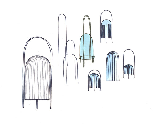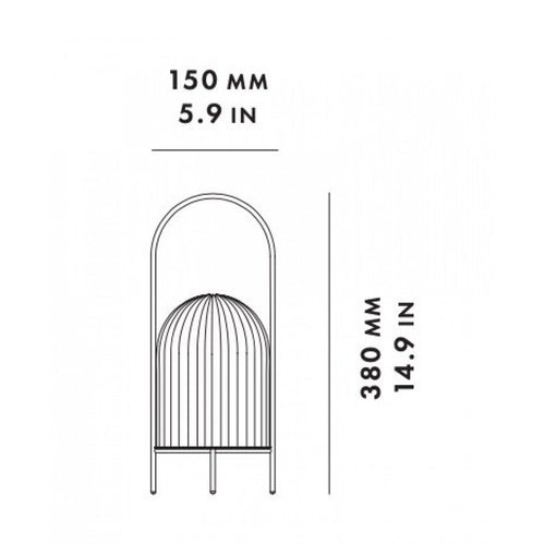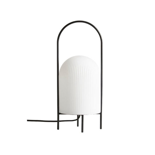 The Ghost table lamp is a modern interpretation of antique portable oil lamps. The slim metal rod surrounds the lampshade protectively while the overarching bail functions as a handle for carrying the lamp around. Made of translucent opal glass, the shade gives an illusion of a white cloth thrown over the light source. Resembling the appearance of a friendly ghost in the air. The subtle vertical groove pattern on the surface fades out gradually upwards, emphasizing the lamp’s refined sculptural character. The cord comes with a dimmable switch.