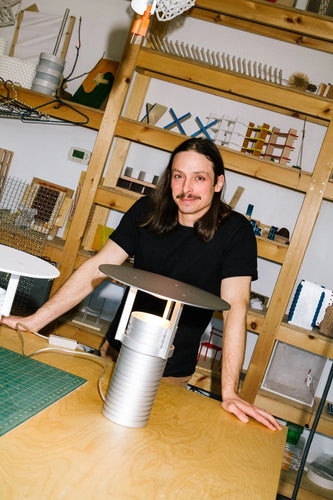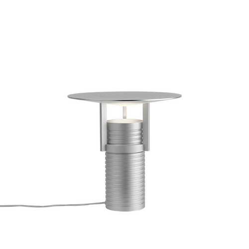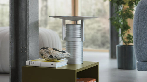 With its distinctive blend of industrial and sculptural design, the Set Lamp features an upward-facing light that shines through an aluminum shade, emitting a bright yet indirect glow. The lamp's adjustable shade height, facilitated by threads on the body, allows for a tactile rotation and enables personalized changes in angle and light intensity. This unique lamp exudes character and seamlessly blends into a variety of spaces—whether placed on the floor, windowsills, sideboards, or any preferred location—making a bold statement as a distinctive centrepiece.According to the designer: