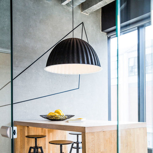 The lamp embraces and shelters the table and people beneath it – both physically and in a more abstract sense. The material absorbs sounds and helps to improve the acoustics of the room, making Under the Bell a perfect luminaire above the dining table and in other spaces where people gather to talk together.