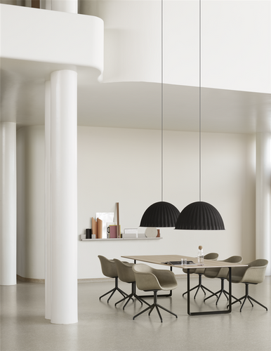 Muuto's Under the Bell pendant lamp has a large, round shade made of recycled plastic felt. When hung over a table or in an open environment, Under the Bell creates its own space within the bigger space.