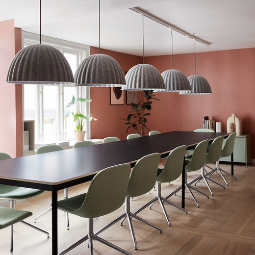 The lamp embraces and shelters the table and people beneath it – both physically and in a more abstract sense. The material absorbs sounds and helps to improve the acoustics of the room, making Under the Bell a perfect luminaire above the dining table and in other spaces where people gather to talk together.