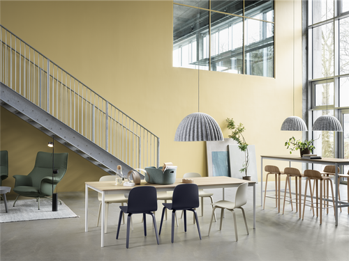 Muuto's Under the Bell pendant lamp has a large, round shade made of recycled plastic felt. When hung over a table or in an open environment, Under the Bell creates its own space within the bigger space.