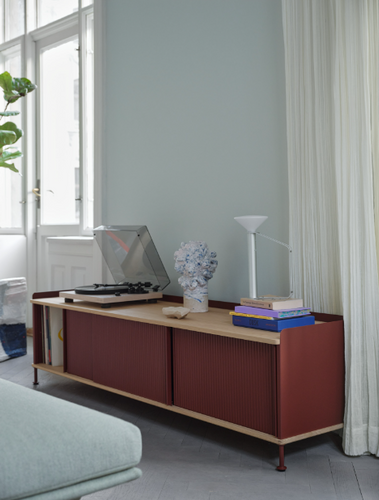 The Enfold Sideboard combines industrial materiality with residential references for a new perspective on modern storage. Made from a lacquered steel that gently enfolds its top and bottom in solid oak, the Enfold Sideboard fuses cold and warm materials for a unique expression, paired with the vibrantly modern expression of its ridged steel doors. The flexible design is available in four sizes, which all have adjustable shelves and discreet cable outlets. This offers the opportunity to find just the right fit for your space, function and needs — be it a media console, in the hallway or a tall sideboard for storage.