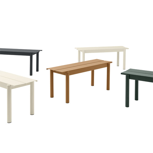 The Linear Steel Bench brings new perspectives to modern outdoor furniture through its straight lines alongside the folded edges, halfcircular intersecting legs and small spacing for easy removal of water. Kept visually clean for long-lasting aesthetics, the Linear Steel Bench finds its distinct character through subtle detailing and a simple expression, allowing for it to complement any outdoor setting. The Linear Steel Bench is designed in proportions that allow for it to slide easily under the matching Linear Steel Table.