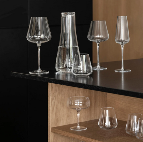 Complete your BELO sets with white wine glasses, red wine glasses, champagne flutes, champagne saucers, tumblers, water carafe and wine decanter. Mix and match with colored BELO glassware for a striking presentation.