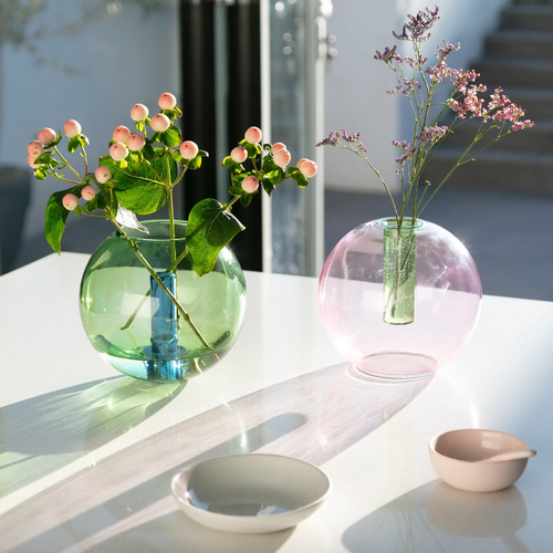 Hand-crafted from borosilicate laboratory glass, the coloured vase displays clean lines, complementing the natural florals within. Simply adding water creates a visual impact as the shapes within the vase interact.
