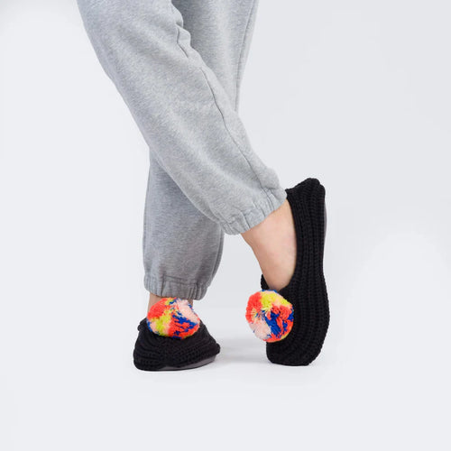 Our classic indoor knit slippers topped with a brightly colored 3" pompom. Plush and padded with the softness and cozy fit of your favorite socks. Fleece-lined with a wide toe box, stretchy knit body, and microfiber sole with slip-resistant patches. Made with deadstock yarn. Washable. Seamlessly knit for less material waste—part of our mission to make happy knits that send less to landfills.