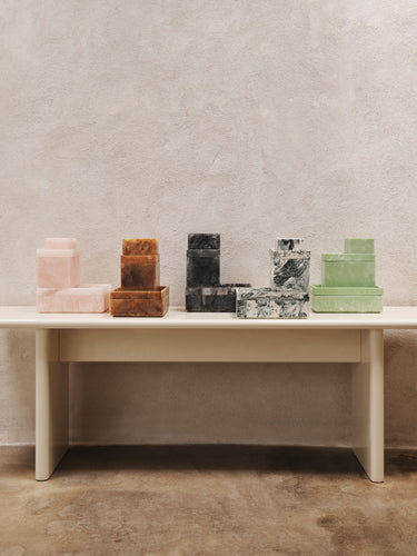 The Mist Series offers a sophisticated blend of playful geometry and functional design. Each piece in this whimsical series allows you to create your unique combination with interlocking, stackable forms. Crafted from a resin blend, the Mist Tray features fluid, swirling shapes and ethereal tones, making each tray truly one-of-a-kind. Perfect for displaying self-care products, accessories, and other treasures, the tray seamlessly integrates itself into any room in the home. Available in various sizes and sold separately, the Mist Tray meets a range of home storage needs with elegance and style.