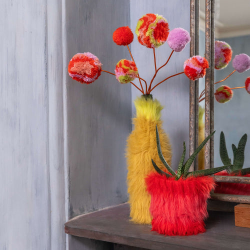 Set of 6 modern, fluffy pom flowers on flexible yet sturdy 12” long metal wire. Each bouquet includes 1.5” small and 2.5” medium pom flowers. Arrange in a vase or add anywhere a pop of color is needed. Made from repurposed deadstock yarn.