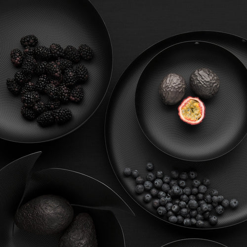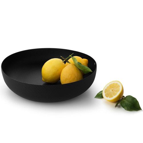 Round basket in steel coloured with epoxy resin, black with relief decoration.