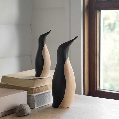 Hans Bunde originally created Penguin in 1954, one for each of his sisters. Penguin is available in two sizes, small and large, and it is made of beech wood. The hand-painted back represents the silky feathers of the bird, and the chest is left unpainted to represent the white bellies penguins are well-known for. Although extremely simple, Penguin is designed in a way that no one could mistake it for another species. These delightful penguins make the most wonderful gifts.