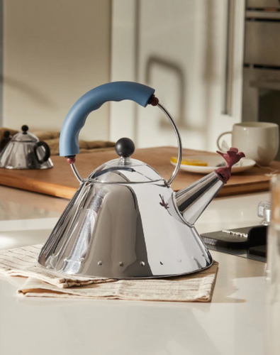 It's no surprise that the Alessi Kettle with Bird Whistle has sold more units than any other item in Alessi history. Designed by Michael Graves in 1985, the Alessi bird kettle has a youthful personality and a simple geometry, allowing it to heat faster than other kettles thanks to its tapered stainless steel body and spout. The bird spout cheerfully whistles when the water has reached a boil.
