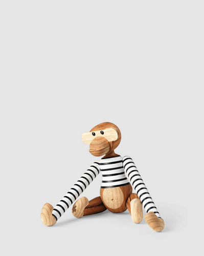 The small Kay Bojesen Monkey x Nørgaard paa Strøget is made from FSC® certified teak and limba, measuring 18.5 cm in height. You can get Monkey with the beautiful painted Nørgaard paa Strøget #101 T-shirt in either this black with white stripes or white with black stripes. Both colours feature the well-known red neckline, which you can only find on #101 T-shirts in this exclusive Nørgaard paa Strøget version in the store on Amagertorv in Copenhagen.