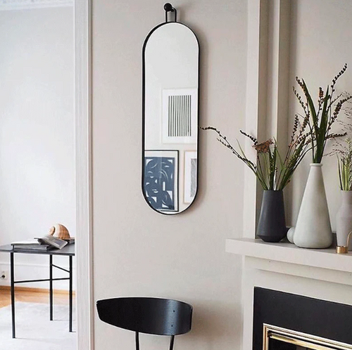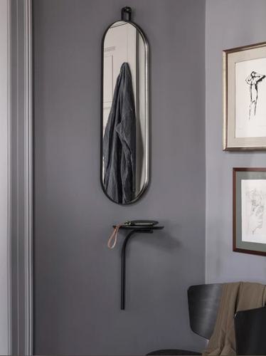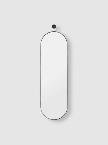The elegant lines and simple shape meet in a beautiful oval mirror with a black powder-coated metal frame. Its oblong form explores the dimensions of the circle and draws a straight line to our unique geometric design language. The included black wooden peg complements the strict silhouette with a natural finishing touch.
