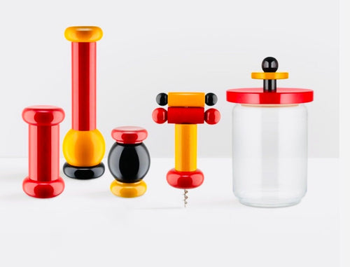 A salt, pepper and spice grinder in beech-wood designed with unique voluminous shapes and bright colours typical of Ettore Sottsass’s style.
