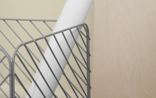 Track is comprised of diagonal steel rod tracks that form a minimalist and airy construction. The tracks run in opposing directions on each side, thereby creating a fine pattern of small squares when you look through the basket. You can create new expressions by placing the baskets inside one another, and when the baskets are full, the sporty, diagonal pattern of the mesh becomes apparent.