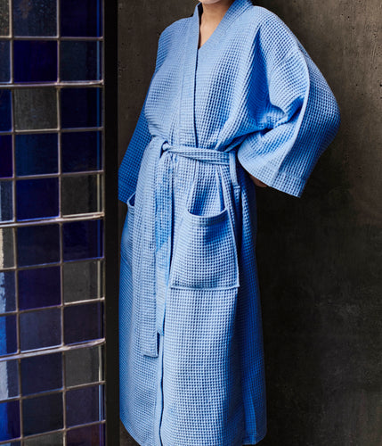 The Waffle Bathrobe is a series of versatile bathrobes in a soft and durable cotton-blend with a distinctive three-dimensional waffle texture. Featuring a relaxed shape, pockets and matching tie belt, it is a stylish and functional design that can be used around the house, on the beach or by the pool. Available in different colour options. OEKO-TEX® STANDARD 100 cert.