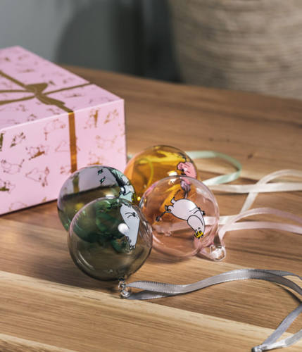 Create a cozy feeling of Christmas with these Moomin themed glass balls. Each piece comes with a satin ribbon for hanging on the Christmas tree.
