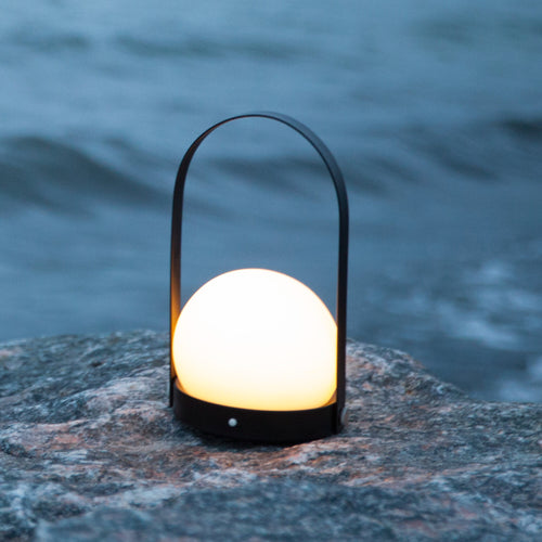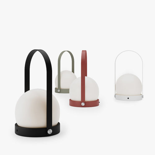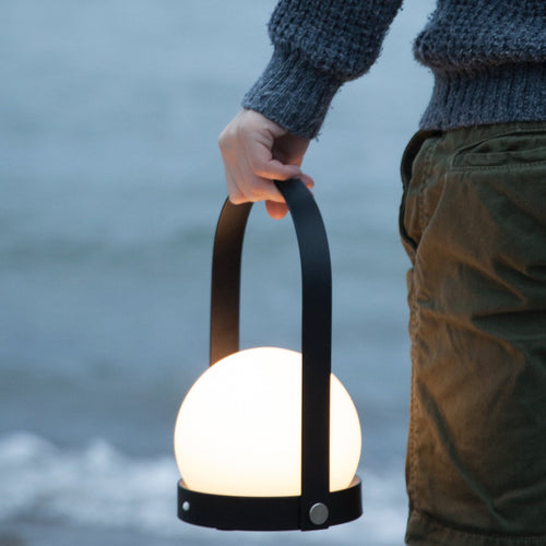 Designed as a portable, lightweight lamp, the Carrie LED Lamp is unique for its multiple uses and mutability. With a sleek, functional handle and a warm orb of light nestled gently in a basket-like base, the lamp is useful almost anywhere; even on the go, as it is cordless and comes with a USB charger. Move it from your office to your bedside table, to your evening picnic in the park and in your bicycle basket as you ride home. The cosy light created by this special piece of lighting brings comfort and sophistication wherever you are. The portable LED lamp comes in black, white, burned red, olive green and brushed brass. It offers a low, warm light in three dimmable settings perfect for creating a cosy ambience. Fully charged, it will stay on for ten hours. The lamp can also be hung on the wall by the handle, and the handle can also be easily detached.